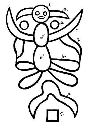 Mexican Tablet No. 339: This interesting little tablet symbolizes the Four Great Primary Forces, in the shape of a butterfly, flying through space and evolving law and order out of chaos in obedience to the command of the Creator--His first command in Creation.