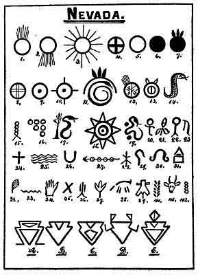 Nevada. The following symbols have been found carved upon the rocks of Nevada. Some of them were etched before the mountains were raised on which they now stand, others were written after the mountains had gone up. There are two distinct dates when these writings were made. Those that were etched after the mountains went up are much more recent than those which were written before the mountains were raised. Probably thousands of years intervened between the two.